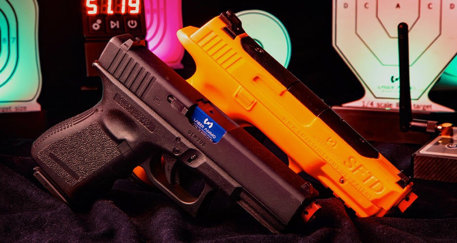 You'll train using SIRT (Shot Indicating Resetting Trigger) pistols and green gas recoil-enabled airsoft pistols equipped with infrared (IR) lasers. These training pistols do not fire live ammunition, but they closely mimic the function and feel of real firearms—down to the trigger pull, recoil, and reload mechanics.